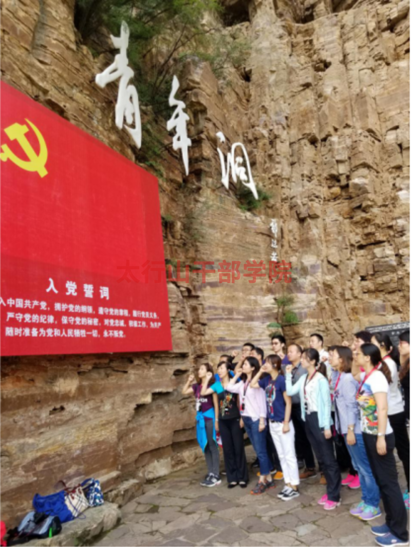 全体学员在红旗渠咽喉工程青年洞重温入党誓词。,在革命先辈奋战过的地方,在党旗下庄严宣誓,拥护党的纲领,遵守党的章程,履行党员义务,执行党的决定,严守党的纪律,保守党的秘密,对党忠诚,积极工作,为共产主义奋斗终身,随时准备为党和人民牺牲一切,永不叛党。
